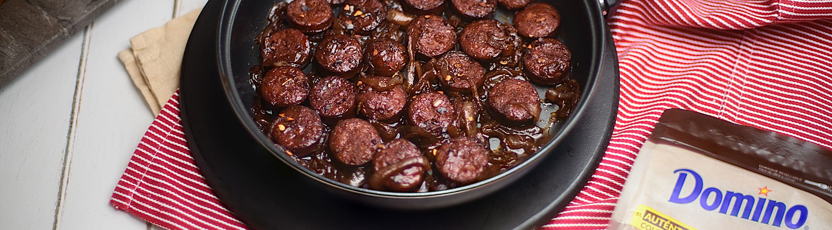 Coloca a fuego medio un sartén pequeño, y añade el aceite de oliva. Agrega la cebolla rebanada, fríela hasta que comience a dorarse, (de 1 a 2 minutos). Agrega el chorizo rebanado, sazona con la pimienta negra, las hojuelas de chile seco y el Azúcar Mascabado Domino®. Revuelve todo muy bien utilizando una pala de madera. Añade el vino tinto. Mezcla y baja la flama. Deja que el vino se reduzca y espese, (de 2-4 minutos).