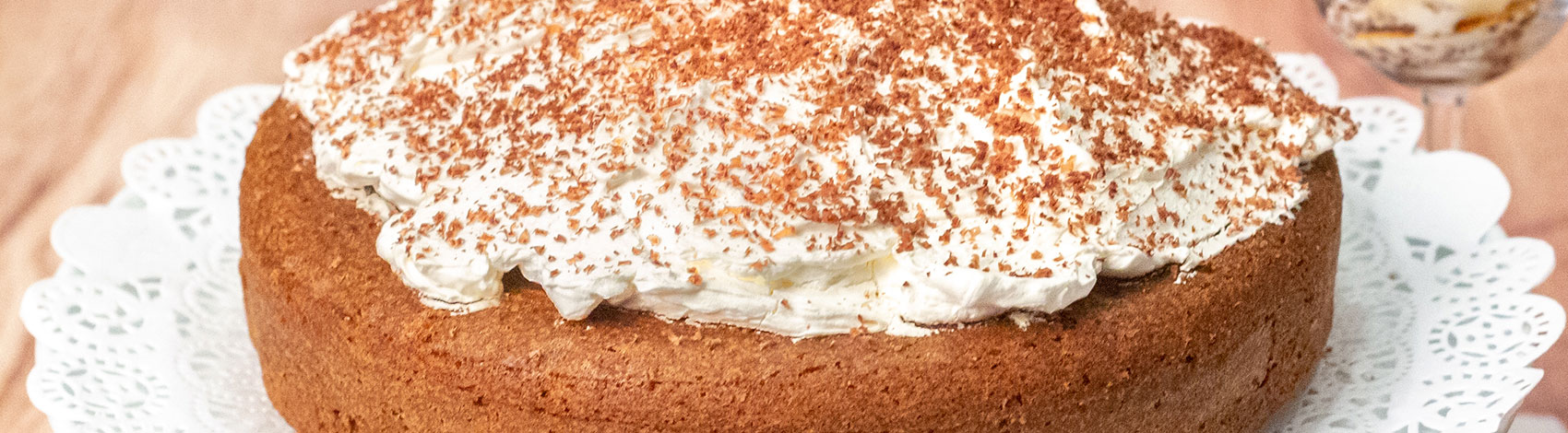 Coloca la crema sobre el pastel extendiendo en forma de nube. Espolvorea con virutas de chocolate o chocolate rallado. Sirve cortando el pastel con las copas, baña cada una con un poco del jarabe de café por encima al gusto, ¡y disfruta!