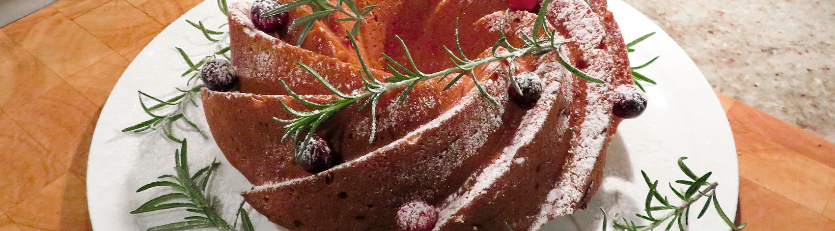 Pincha los arándanos frescos con palillos de madera e introdúcelos al pastel, coloca las ramitas de romero y espolvorea azúcar glass al gusto.