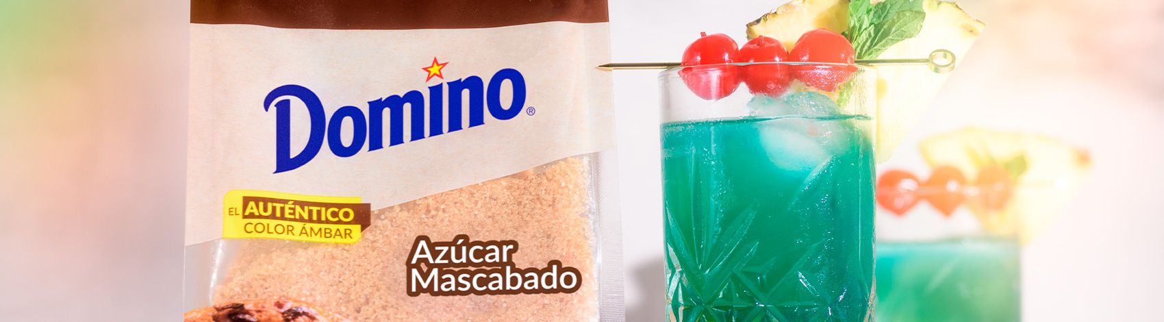Rainbow paradise es un cocktail en capas de colores elaborado con ron blanco o vodka, jugo de limón, jugo de piña, hojas de hierbabuena, granadina, blue curacao y endulzado con Azúcar Mascabado Domino®, decorado con rebanada de piña, cereza y hojas de hierbabuena.
