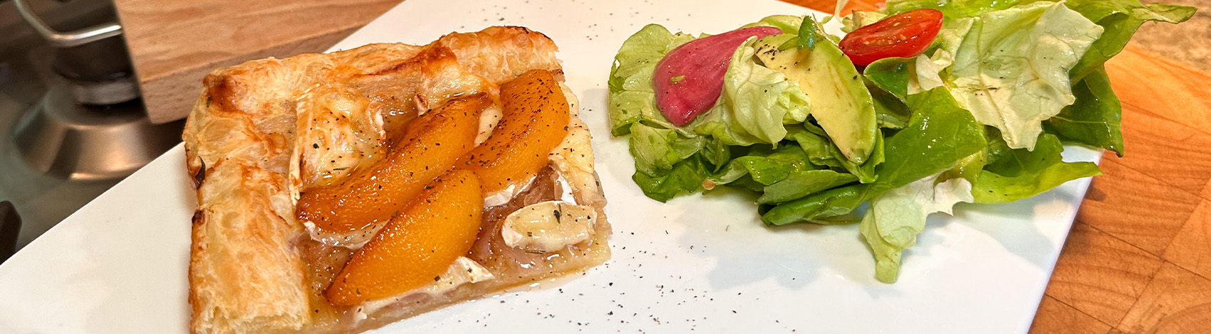 Dobla los bordes de la masa hacia adentro. Barniza los bordes con más huevo batido. Utiliza un tenedor para presionar las orillas. Transfiere al horno y hornea de 12 a 15 minutos, hasta que la masa esté dorada y el queso se derrita. Sirve la tarta añadiendo un poco del jarabe reservado de los duraznos. Puedes acompañarlo con una ensalada verde, y listo, ¡a disfrutar!.